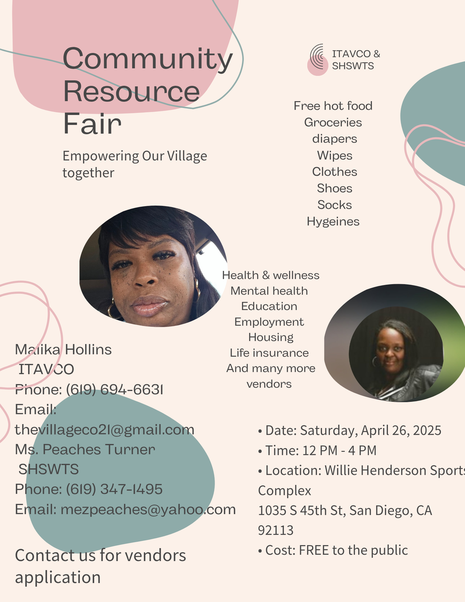 Past & Current Employment of Malika Hollins Current Roles: • Founder & CEO, It Takes a Village Community Organization (ITAVCO) – Leading a nonprofit that provides mentorship, education, and essential resources for underserved youth, young adults, and families. • Case Manager, Serving Youth & Young Adults (16-24 years old) – Supporting individuals in overcoming barriers to success. • UPAC CVRT Team Mobile Response – Providing comfort, resources, and financial support to families affected by homicide, organizing fundraisers for funeral expenses. • Owner, Stacks Café 18 – Running a catering business that supports employment opportunities for those in need. • LIFE (Living Independently is for Everyone) – Empowering adults with disabilities to lead independent lives. • Elder Care Provider, IHSS (In-Home Supportive Services) – Assisting seniors with essential daily care. Past Roles: • San Diego Unified School District (16 years) – Started as a volunteer while raising her daughter as a single mother, later becoming an employee supporting students and families. • Volunteer, The Compassion Project – Provided love, support, and resources to families grieving the loss of a child. • Community Fundraiser – Organized efforts to help over 100 families bury loved ones. Malika’s work has always centered on breaking barriers, fostering resilience, and building a stronger, more unified community.